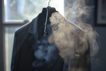 A tailored suit jacket dangles elegantly on a hanger, steam wafting softly around it. Sunlight filters through the window, creating a tranquil atmosphere as the day begins.