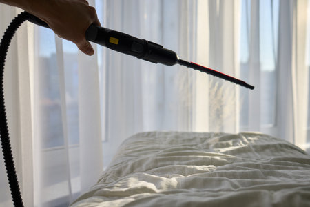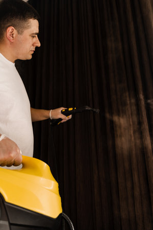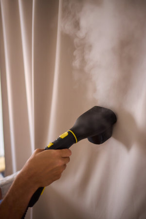 Close-up process of disinfection and dry cleaning of curtains at home. Curtains dry wash using steam machine at home. Steaming of textile curtain