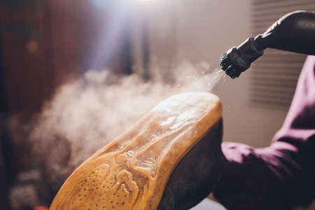 washing the dirty cleaning the shoes with a steam cleaner.