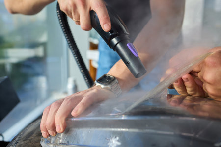Car detailing. Car washing cleaning engine. Cleaning car using steam. Steam engine washing. Soft lighting. Car washman worker cleaning automobile.