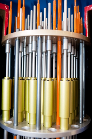 Close-up side view of metal antennas and numbered buttons on the metal panel of radio-controlled equipment in production. Secret military base concept
