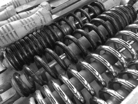 Close up of coil spring used as a part of car or motorcycle suspension system. Stock footage. Details of machines, professional equipment and repair parts.
