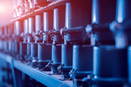 Close-up numerous metal plugs hang next to instrument panels at a factory for the production of specialized equipment. Industrial Manufacturing Concept