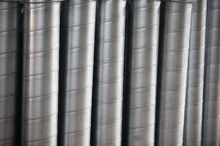 A close-up view of several shiny metal industrial components, possibly nuts or sleeves, lined up on a grooved metal shelf in a factory or warehouse. High quality photo