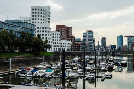 Cloudy day in Dusseldorf's harbour. Cityscape view on Medienhafen full of boats