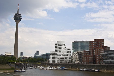Duesseldorf city skyline with harbour, ghery buildings