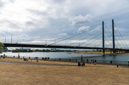 DUSSELDORF, GERMANY - 13 AUGUST 2020: The Rheinkniebrücke is a cable-stayed bridge over the Rhine in Düsseldorf, opened to traffic on 16 October 1969.