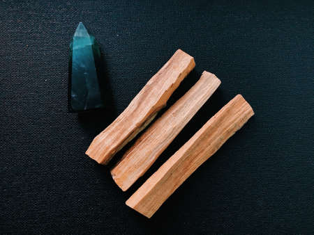 Palo Santo bars close-up and copy space. Ritual cleansing with sacred ibiocai, meditation, aromatherapy with incense and candles.