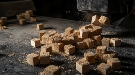 A captivating close-up of scattered wood cubes and sawdust in a woodworking workshop. The image showcases the craftsmanship and tools used in creating unique wood projects.