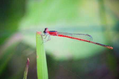 Beautiful orange damselfly perching on tree branch in morning, Nature blurred background, Insects in Thailand.