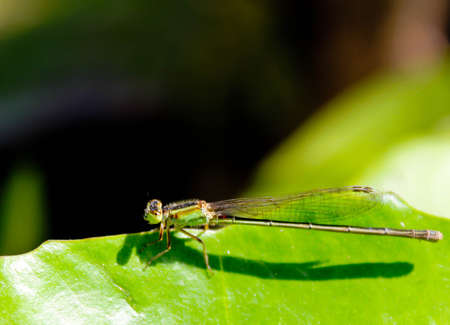 Macro image of a dragonfly on a leaf with a natural background and close up portrait of the insect s