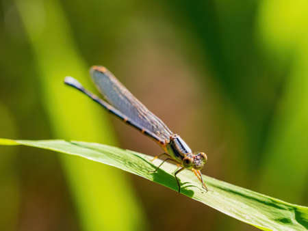 A common bluetail damselfly (Ischnura elegans) resting on a grass, sunny day in summer, Vienna (Austria)