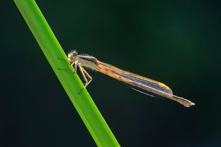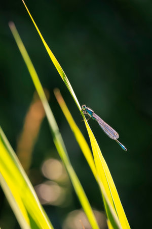 Macro shot of sympecma fusca, the common winter damselfly perching on a straw and resting. Shallow depth of field, green background.