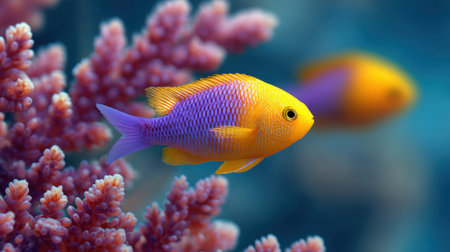 Two vivid tropical fish are swimming gracefully through clear water, surrounded by colorful coral. This stunning underwater scene highlights the beauty of marine life and ecosystems.