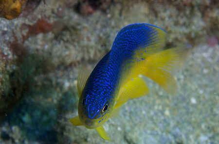 Beautiful blue, yellow azure chrysiptera fish under water.