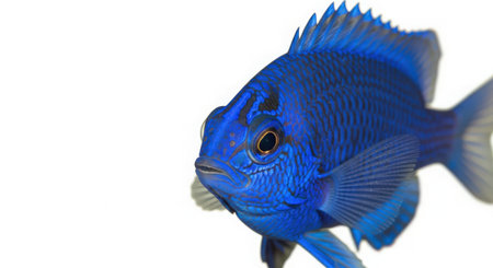 Blue Chromis vibrant marine fish known for striking blue color moves gracefully in a clean white setting highlighting its natural beauty and captivating features.