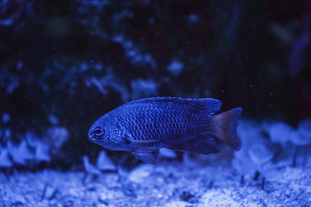 Azure Damselfish, Chrysiptera hemicyanea, swimming on a reef tank with blurred background. download image