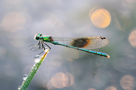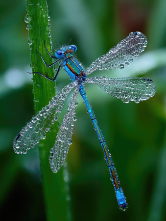 A close-up captures a dragonfly perched on a green stem, its wings adorned with glistening water droplets. The image showcases the insect's intricate structure, highlighted by blue and teal hues. The soft-focus background complements the macro details, suggesting a natural outdoor environment. Suitable for nature-themed projects and stock photography.