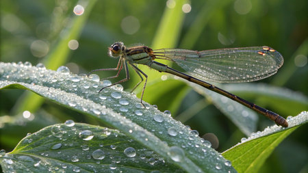 Still moment of dragonfly resting, water droplet magnifying leaf beneath