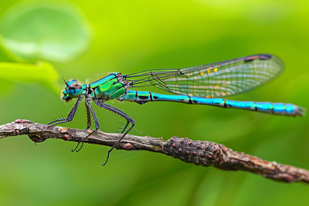 A striking image presents a dragonfly, showcasing iridescent blue and green wings. The insect rests on a twig, its delicate form captured in detail against a dark, blurred backdrop. The composition highlights textures and colors, possibly suitable for nature-themed projects, scientific illustrations, or environmental content.