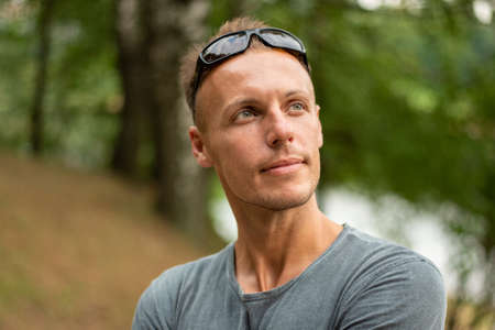 portrait of a Handsome young strong sports man posing outdoors at the nature park location