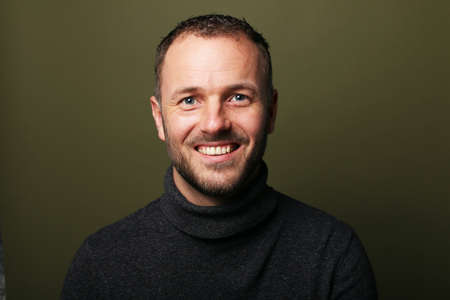 Portrait of a handsome bearded young man in a black sweater posing against a colorful background.
