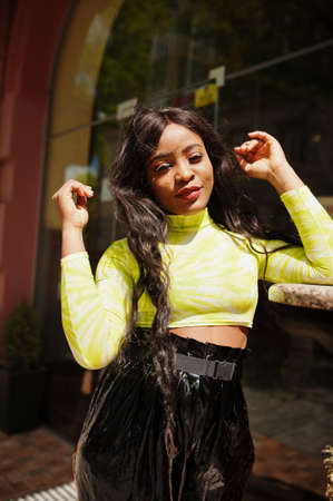 Portrait of young beautiful african american fashion model woman, wear in green top and black shiny wet look pants.