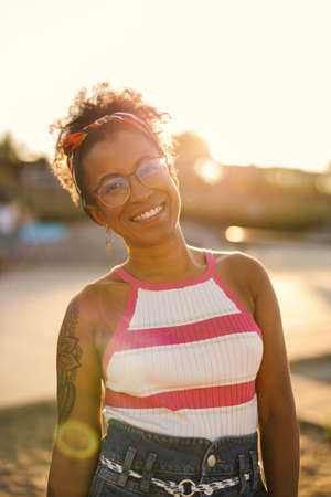 Happy young black woman smile. Stylish model. Joyful smiley African American female in selective focus outdoors, fashion style, happiness concept
