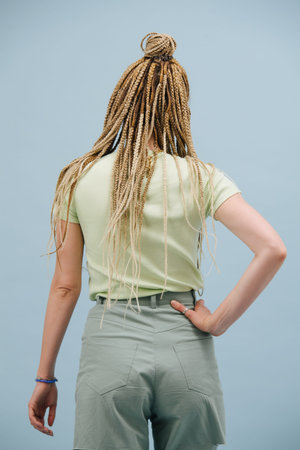 Backside of a young woman with stylish blond afro braids over blue background. Hand on a hip.