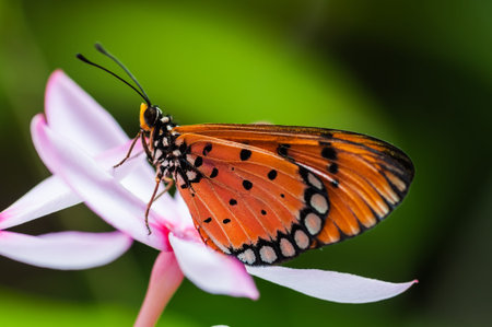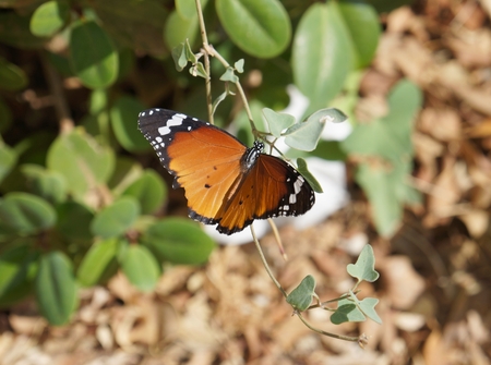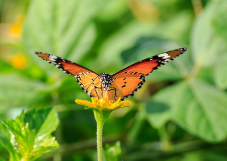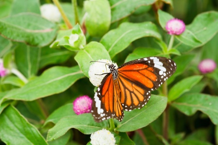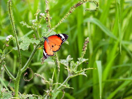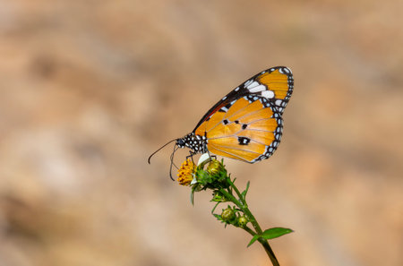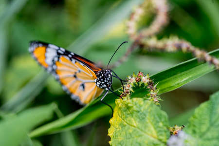 Plain tiger butterfly eating sweet nectar of flower in the garden.