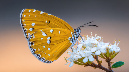 Extreme photograph capturing an orange butterfly with white spots on its wings perched on a small cluster of white flowers against a softly blurred, gradient background.