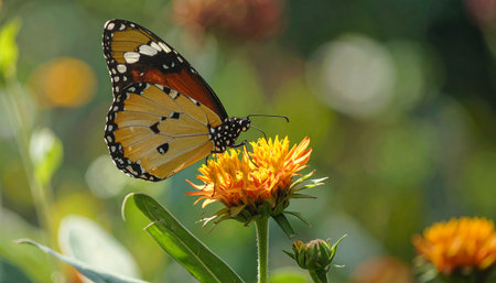 A vibrant monarch butterfly rests on a bright orange flower, surrounded by lush green foliage in a sun-drenched garden setting.