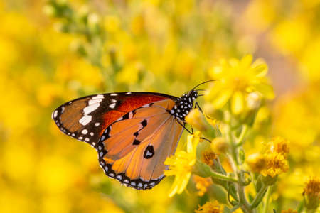 Common tiger butterfly (Danaus plexippus) on yellow wildflowers