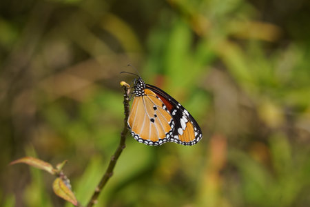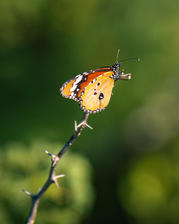 Plain tiger butterfly on a thorny stem. Soft bokeh green natural background