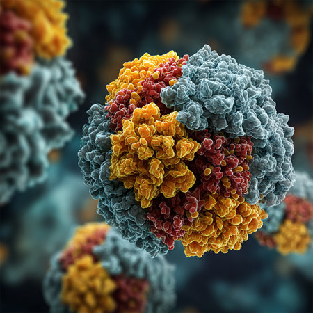 A detailed 3D illustration of a virus or nanoparticle AAV capsid, showing the complex molecular structure with blue and orange surface proteins. Represents microbiology, virology, biotechnology, gene therapy, vaccine research, and medical science.