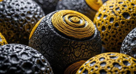 Close-up captures spherical objects showcasing intricate textures and contrasting colors. The composition highlights a pattern of detailed surfaces and spiral centers. Vivid yellow and black hues create visual interest. This abstract image is suitable for various commercial uses and design projects.