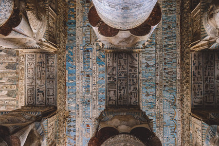 View to an Ancient Egyptian Painted Pillars of the Dendera Temple complex in south-east of Dendera, Egypt