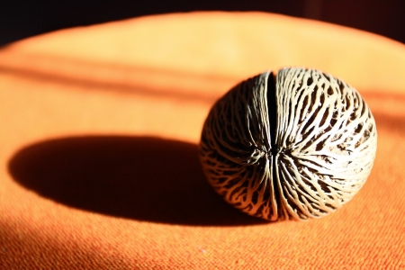 Heap of processed areca nuts cut in half revealing deep orange brown radial internal structure and dry exterior