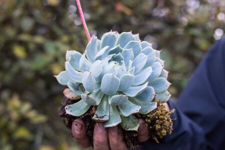 Closeup of sempervivum tectorum plant in a hand.