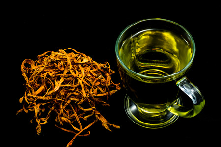 Dried cordyceps militaris mushroom with glass on the dark