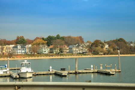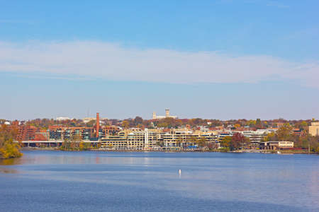 Potomac River waterfront at Georgetown Park in the early autumn morning. Fall panorama of Georgetown suburb in Washington DC USA