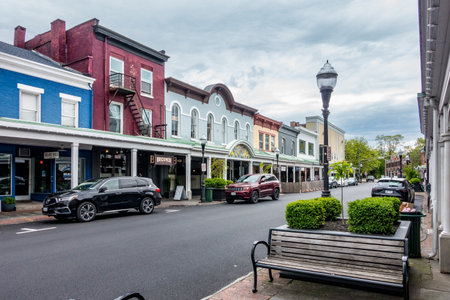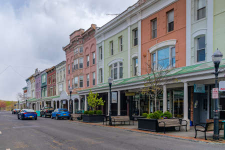 Kingston, NY - USA- May 12, 2021: a landscape view of the shops and restaurants on Broadway in The Rondout, Kingston’s historic waterfront