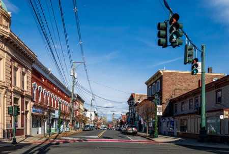 Beacon, NY - USA - Nov. 29, 2020: Landscape view of the corner of Main Street and South Street in Beacon, NY