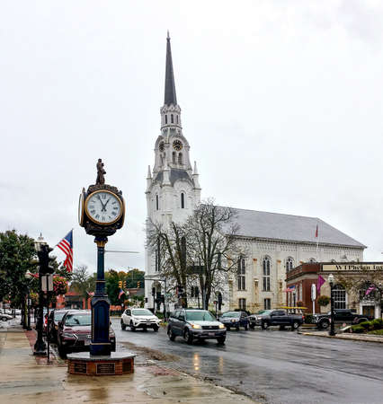 Woburn, MA / USA - Oct 13, 2018: Street Clock and Italianate-style First Church of Woburn on rainy autumn morning. 196' wooden steeple is tallest in North America. Congregation was originally Puritan.