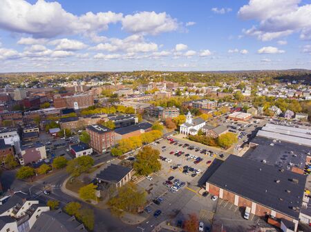 Waltham City Hall and downtown with Boston skyline at the background aerial view in downtown Waltham, Massachusetts, MA, USA.