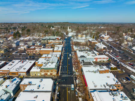 Lexington historic town center aerial view on Massachusetts Avenue in winter with Lexington Common and First Parish Church on the background in town of Lexington, Massachusetts MA, USA.