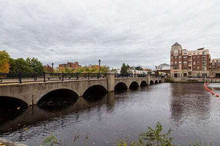 View of Rotary Park and historic buildings along the Winnipesaukee River, in Laconia, New Hampshire.