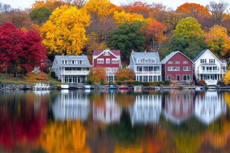 Charming lakeside houses with vibrant autumn foliage reflecting in calm water on a serene fall day.