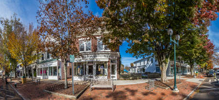 East Hampton, USA - October 27, 2015: view to Main street in East Hampton with old victorian wooden buildings on a sunny day.