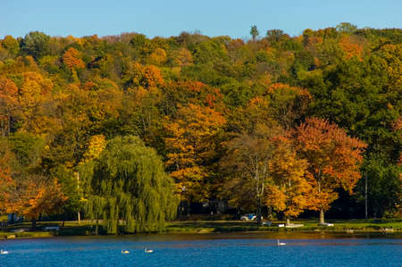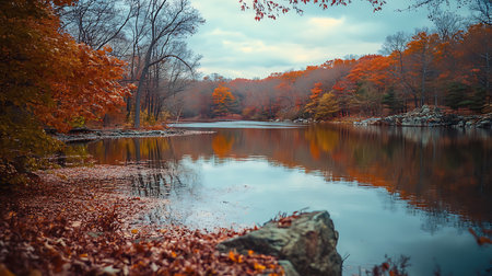 Autumn scenery with trees by the lake.